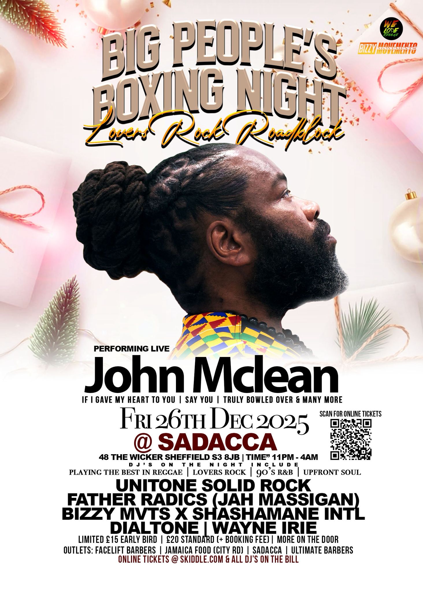 FeaturedSADACCA, 48 The Wicker, Sheffield, S3 8JB Sheffield, United KingdomGet ready for Big People’s Boxing Night – Lovers Rock Roadblock on Friday 26th December 2025 at SADACCA, Sheffield! Enjoy a special live performance by John McLean, plus top DJs including Unitone Solid Rock, Father Radics, Bizzy MVTS x Shashamane Intl, Dialtone, and Wayne Irie. Expect the best in Reggae, Lovers Rock, 90s R&B, and Upfront Soul from 11 PM–4 AM. Tickets from £15 on Skiddle or local outlets.