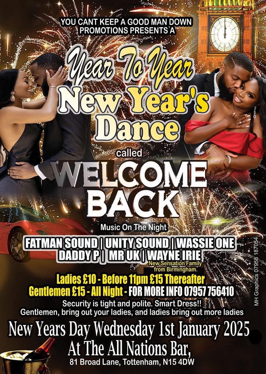 Tottenham, London All Nation's Bar, 81 Broad Lane, Tottenham, N15 4DW, London, United KingdomJoin us for our annual Welcome Back New Year's Dance on January 1st, 2025.